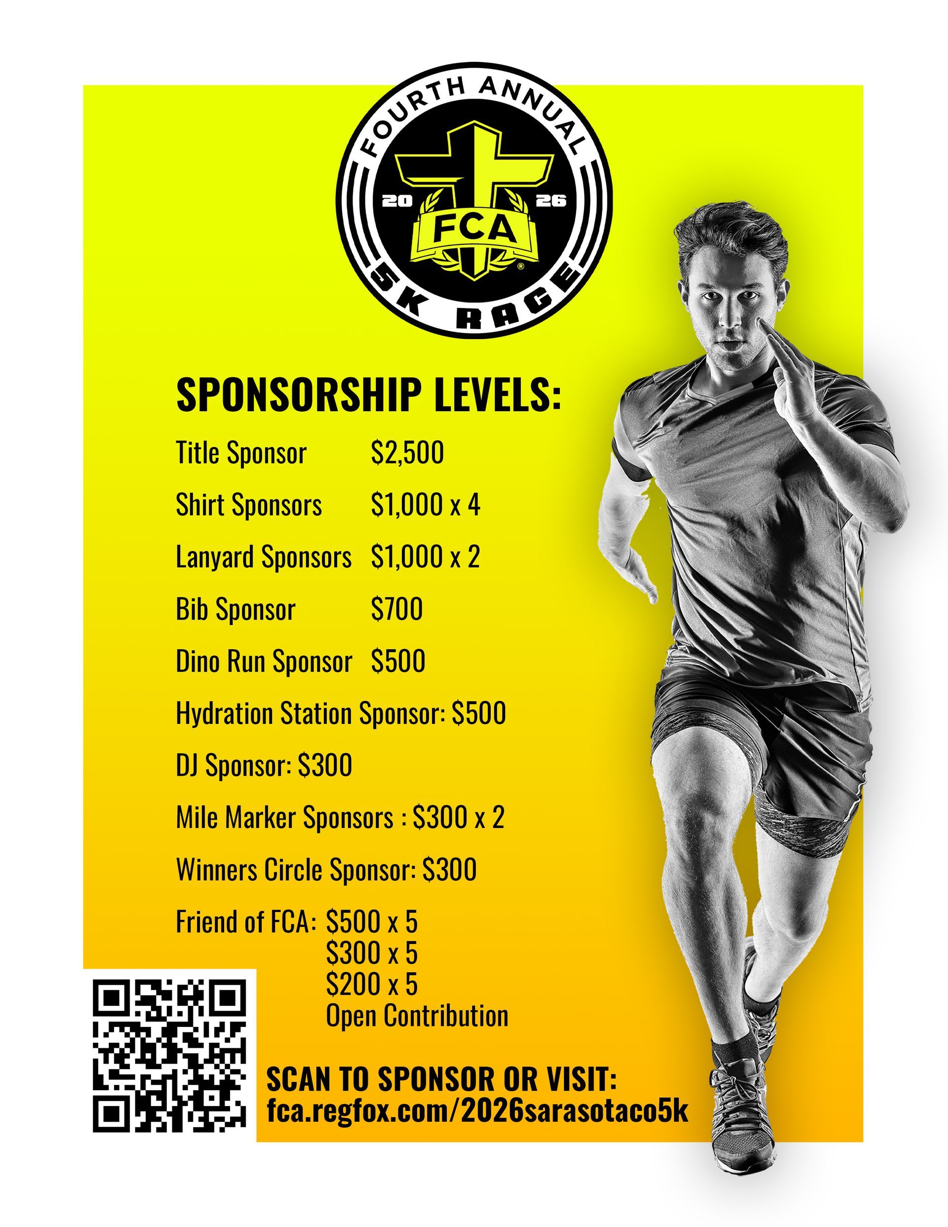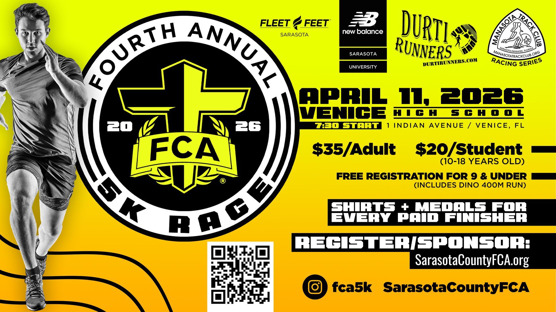 Now that Venice High School's athletic field renovations are complete, we are BACK at VHS for our fourth annual FCA 5K! Register below to run, or you can also become a proud sponsor for this fun experience for all ages.