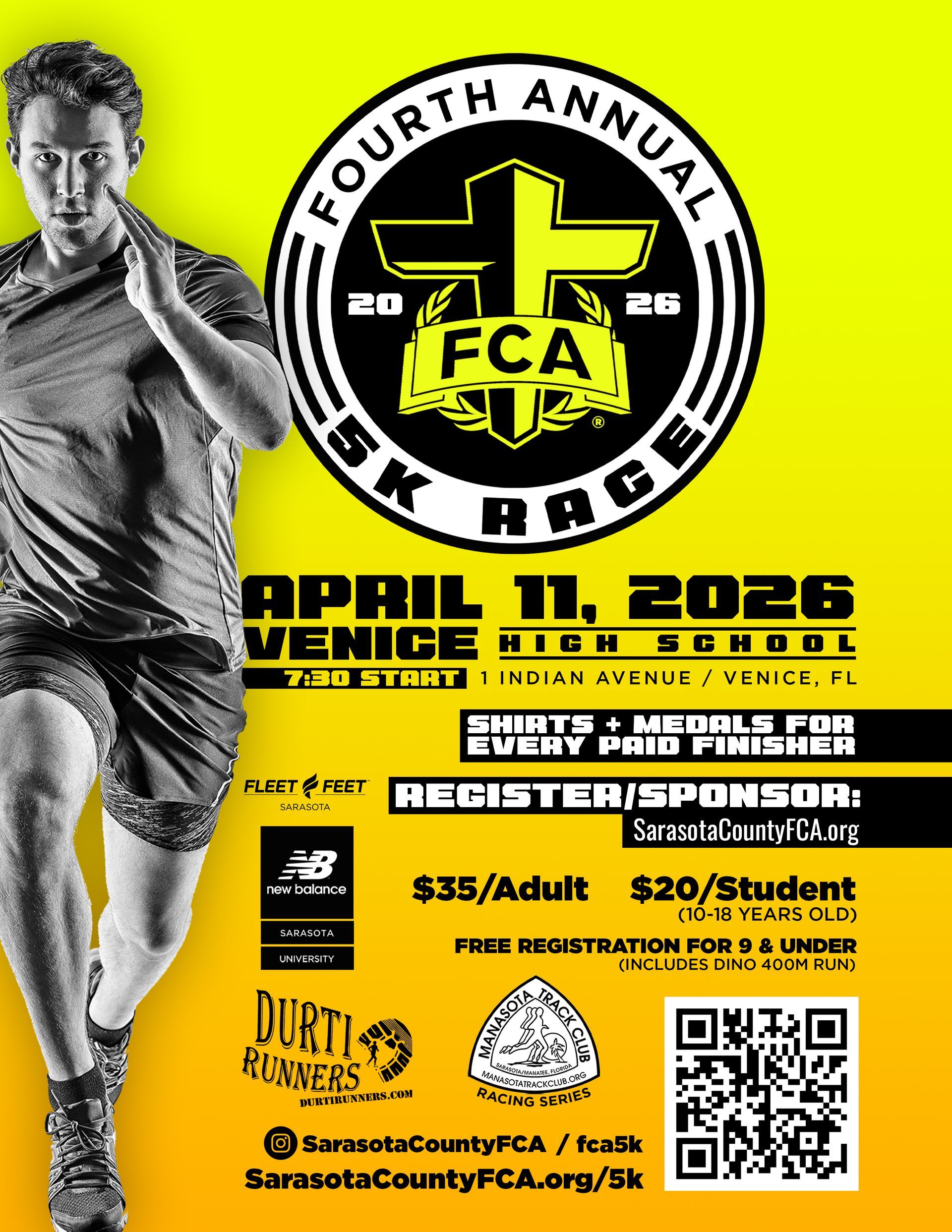 Join us for our second annual FCA 5K as we support student leaders in our community. This event will be a family-focused run, welcoming every runner/walker to join us at Venice High School on April 13, 2024.